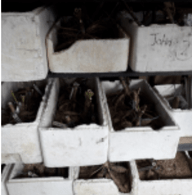 Tuber clumps in their boxes lying on sawdust. The saw dust is dry and tubers will be divided over winter and be lain down in the sawdust. To be dampened off when inducing shoots to grow. You can use any light weight medium for storage that will retain moisture in the spring. Sprinkle slug/snail bait around the tubers as a precaution. Some also sprinkle diazanon too.